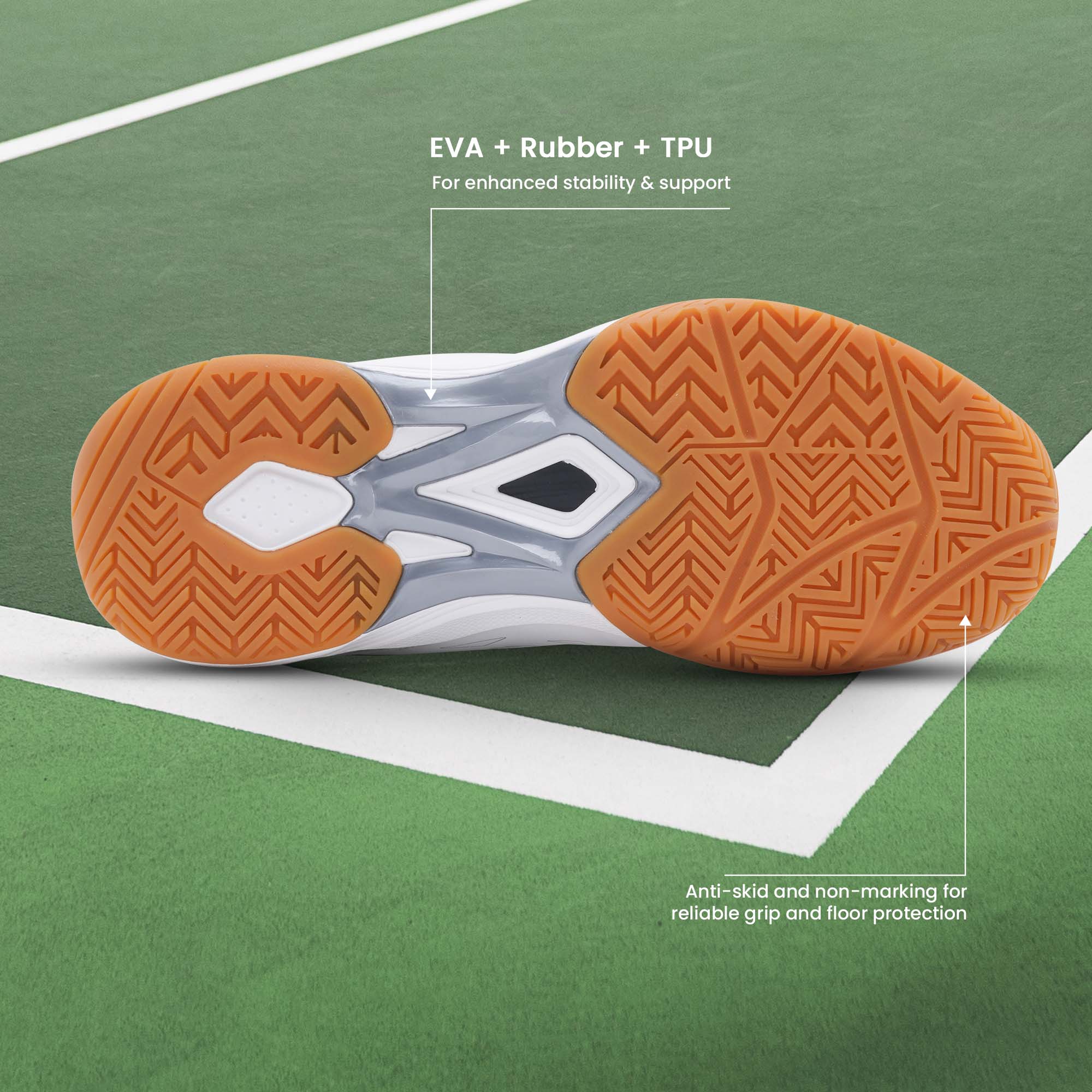 The upper is crafted from a breathable, high-quality mesh synthetic blend that promotes airflow to keep feet cool and dry during intense matches. Reinforced overlays and a structured heel counter provide essential lockdown and ankle support, minimizing the risk of injury during high-intensity play. Inside, a cushioned insole and responsive midsole work together to absorb shock and provide energy return, ensuring all-day comfort whether you are in the middle of a rally or running errands post-match.